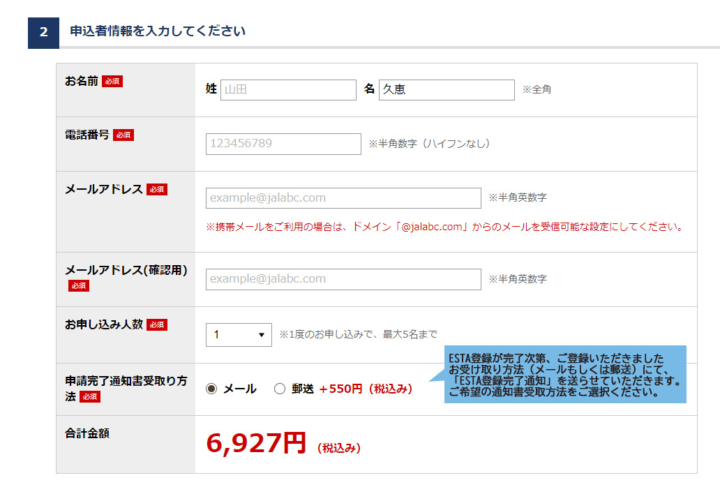 申請完了通知書については、ESTA登録が完了次第、メールまたは郵送でお送りいたします。